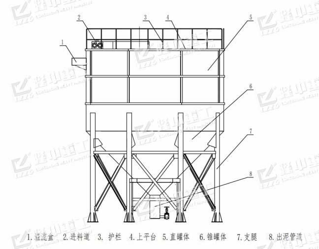 处理物料的废水经过料道进入中心进料筒,并经过缓流、絮凝等一系列作用,使增稠的底流泥浆由罐体底部的出料口排出,并进入压滤机等其他设备,压滤成泥饼。罐体上部产生清洁度较高的清水(溢流澄清液),由顶部的出水口排出,清水可循环利用,实现生产废水零排放。