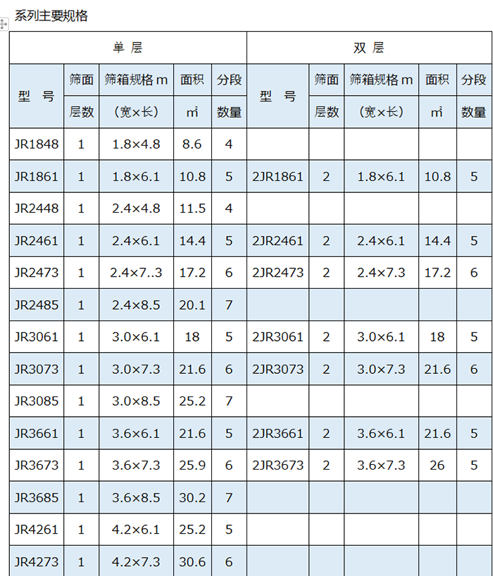 该系列根据筛机不同用途及处理量大小,采用不同的筛分面积、筛缝尺寸、筛面分段数量以及筛面倾角,分单层和双层产品,工作面积5.7m2~30.2m2,共20种主要规格型号,可基本满足各种类型矿井和选煤厂生产需要。