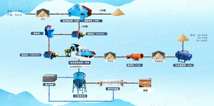 该生产线的工艺流程是:原料—预选筛分—擦洗—脱泥—磁选—洗选脱水—烘干机—筛分的一泥浆净化系列流程来进行石油压裂砂的生产。