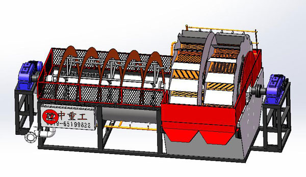 本设备适用于矿山、骨料加工、陶瓷原料加工、硅砂生产加工、各种金属矿尾矿等处理作业。该设备集洗砂、细砂回收于一体。设备将螺旋叶轮于斗式洗砂轮相结合,结构合理,运行简单。该一体机主要分为洗砂部位和细砂回收部位;洗砂部位和一般的轮式洗砂机大致相同,但是在该部位中加入隔板能同时清洗两种不同粒径的颗粒,实现洗砂、脱水、脱泥功能。细砂回收部位和传统的利用旋流器回收细砂有所不同,该设备利用大直径、低转速螺旋叶轮将螺旋水槽中沉淀的细砂缓慢的推入轮洗槽内,再由轮斗带出,经过细砂沉淀后的泥浆水从螺旋尾端溢流出去。与此同时,在螺旋水槽尾部设有可调节的溢流堰板,可通过调节堰板高低来控制细砂回收量。
