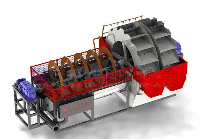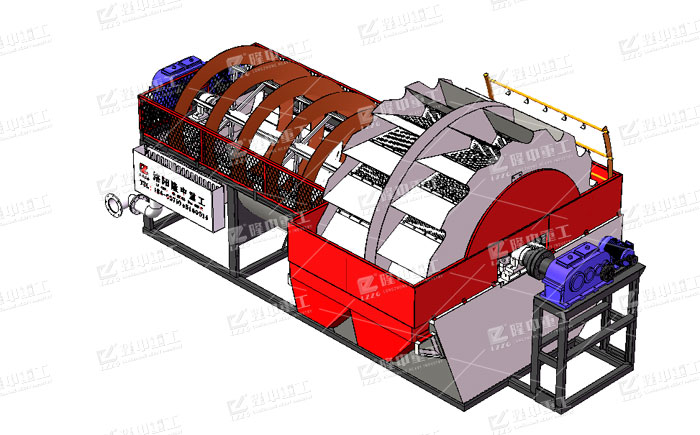 该设备主要分为洗砂部位和细砂回收部位;洗砂部位和一般的轮式洗砂机大致相同,但是在该部位中加入隔板能同时清洗两种不同粒径的颗粒,实现洗砂、脱水、脱泥功能。细砂回收部位和传统的利用旋流器回收细砂有所不同,该设备利用大直径、低转速螺旋叶轮将螺旋水槽中沉淀的细砂缓慢的推入轮洗槽内,再由轮斗带出,经过细砂沉淀后的泥浆水从螺旋尾端溢流出去。与此同时,在螺旋水槽尾部设有可调节的溢流堰板,可通过调节堰板高低来控制细砂回收量。