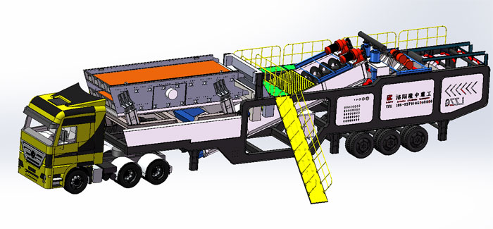 不同于传统固定式洗沙机,该类移动式洗沙机所有部件均安装在独立的车载底盘之上,轴距短,转弯半径小,可以在普通公路上,甚至一些恶劣环境下的作业区内灵活行驶,不J有利于进驻施工合理区域,而且此种特性也可为快捷进驻工地节省大量准备时间。