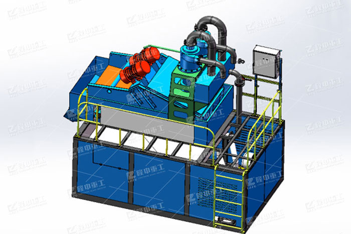 新型细沙回收一体机结构:由泥砂分离器、脱水振动筛、清洗箱、返料箱、碴浆泵、电动机等组成。