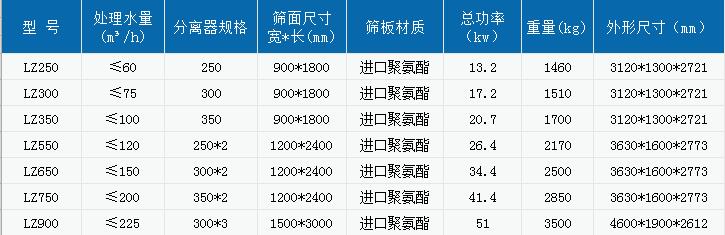 设备详情:处理水量30-650mm,脱水筛功率2*0.75KW-2*4KW,分离器规格250-900mm,沙泵功率11-55KW